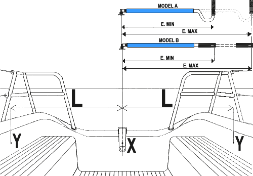 Quando los barcos tienen la medida "L" inferior al tablero, es posible utilizar el modelo B. Se puede establecer la posición exacta manteniendo lo stick a la mitad de su extensión y manteniendo la caña al centro. Para fijar el punto "Y" se necesita acercar el gancho engargolado a su emppuñadura del bañera. y trazar la posicion de los agujeros para los tornillos.